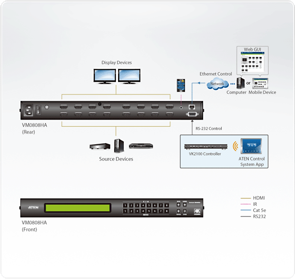VM0808HAは、8系統のHDMI信号をマトリックス状に8系統に切替・分配できる、HDMIマトリックススイッチャーです。本製品は4K解像度※に対応。フロントパネルのプッシュボタンやIRリモコンを使用して、またはRS-232やイーサネット接続を経由して、8台のHDMIビデオソースと8台のHDMIディスプレイ間との信号の入出力の組み合わせをマトリックス状に切り替えることができるので、デバイスの配置も自由自在。わかりやすいGUIを採用しているので、リモートからWebブラウザを使用して、気軽に設定や機器の切替を行うことができます。
